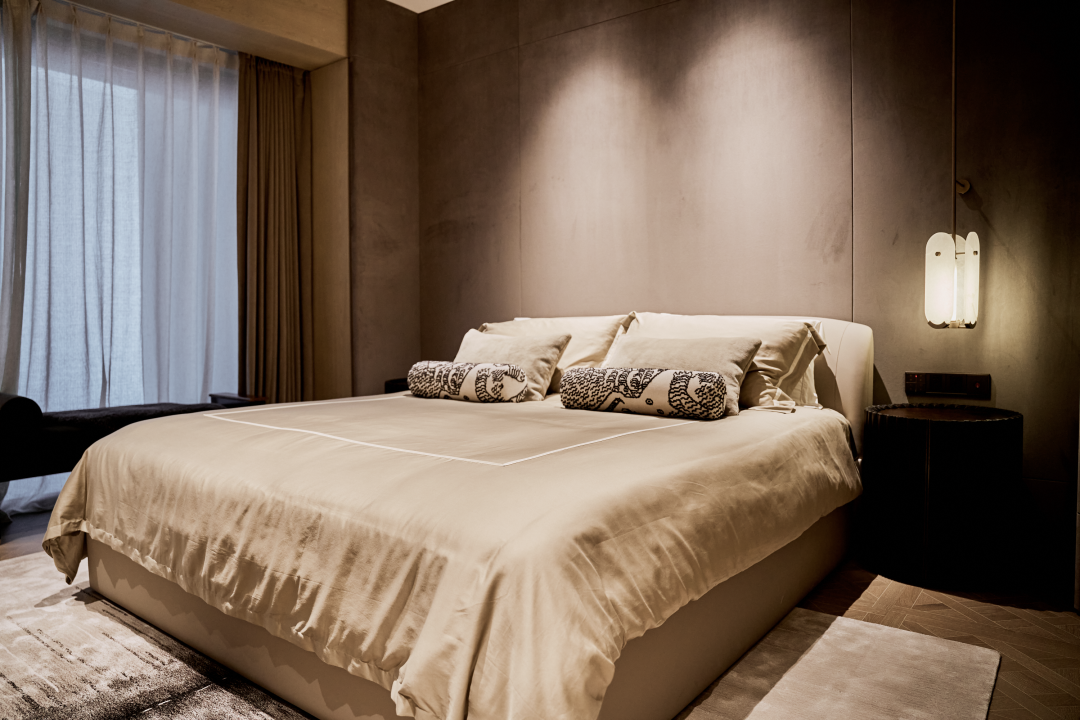 主卧背景墙则采用深灰色面料,配以木饰面,呈现低调奢华的高级感。