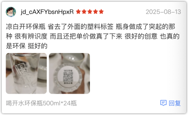 有人说,省去了外面的塑料标签,瓶身LOGO做了浮雕处理,很有辨识度: