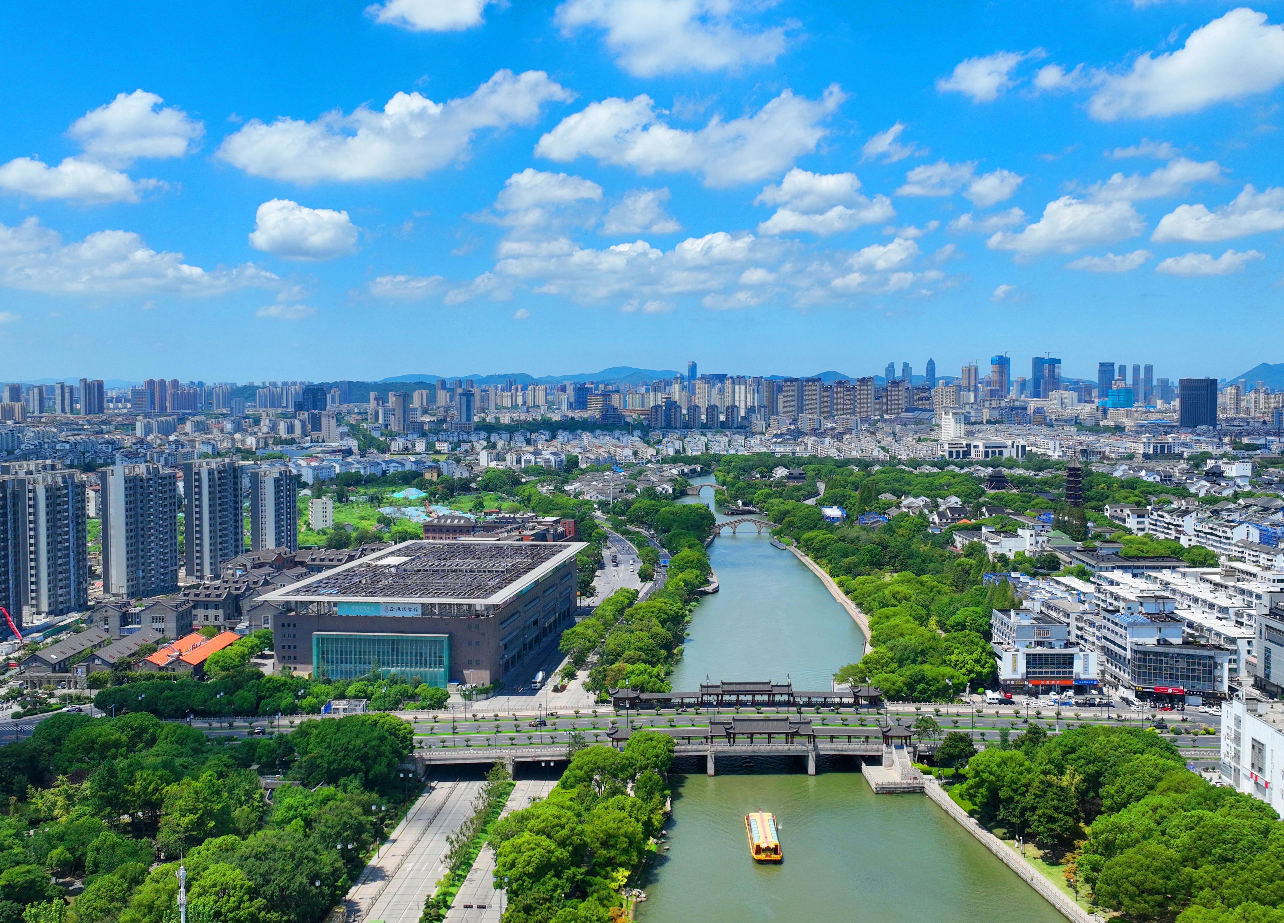 近日,江苏省苏州市迎来晴好天气,碧空如洗。环古城河宛如一条碧玉丝带环绕着千年姑苏城。街坊、河道与蓝天白云相映成趣,勾勒出一幅水韵灵动、绿意盎然的诗意画卷。