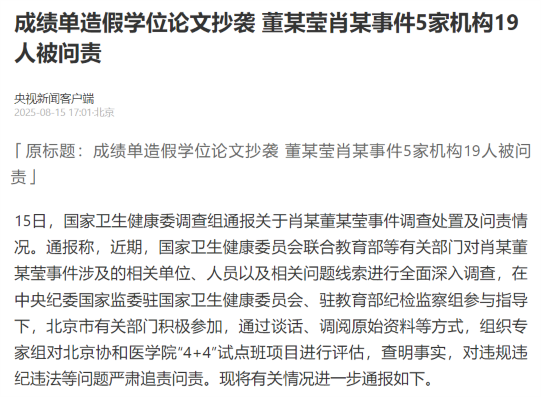最令人关注的是,因为成绩单造假和学位论文抄袭,涉事5家机构、19人被问责。