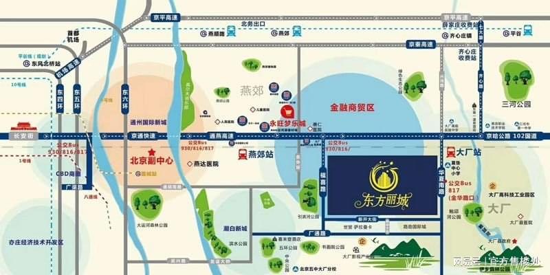 位于大厂县核心城区,距北京副中心通州不足20公里,通过102国道、京秦高速等快速接驳北京。平谷线地铁(2026年通车)、930/816/817路公交直达国贸,通勤优势显著。