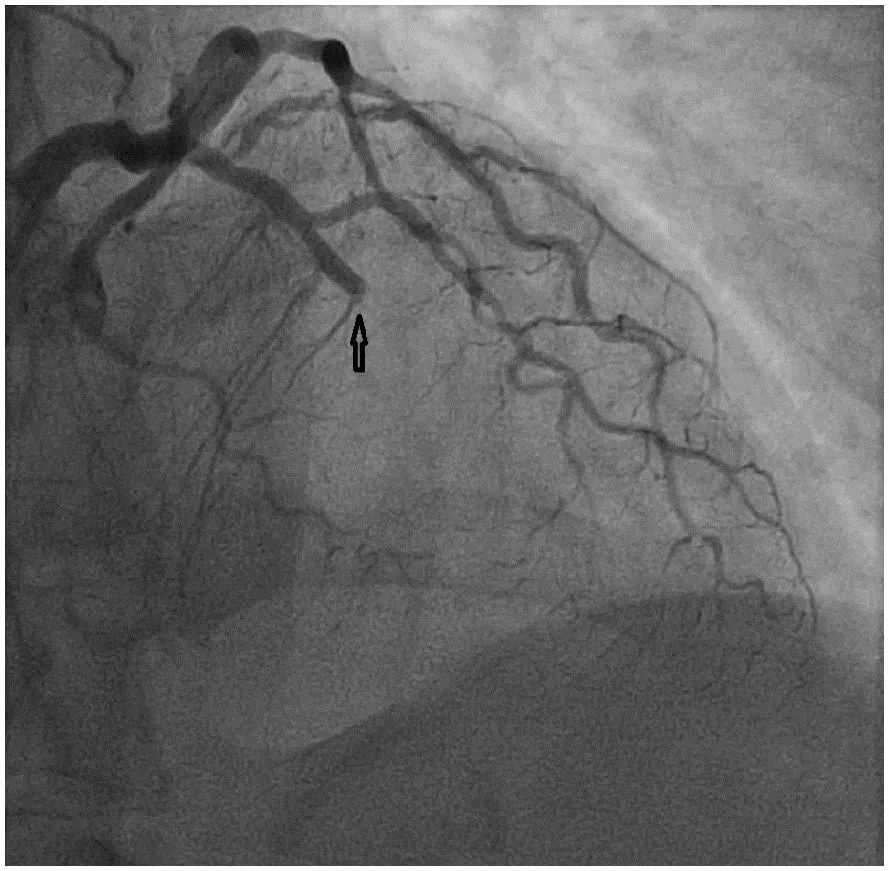 图1 左冠状动脉造影显示100%左中前降支动脉闭塞