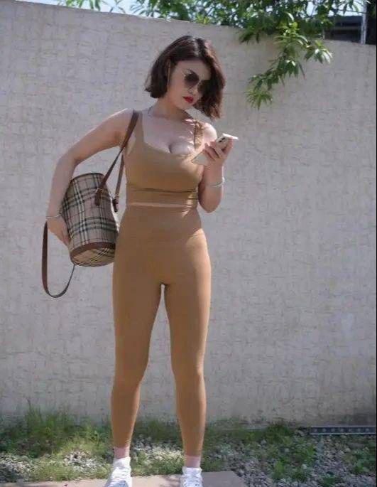 初夏午后的步行街,老远就瞅见个穿浅棕色瑜伽裤配棕色小背心的小姐姐,跟道会动的光似的,走哪儿都吸睛。