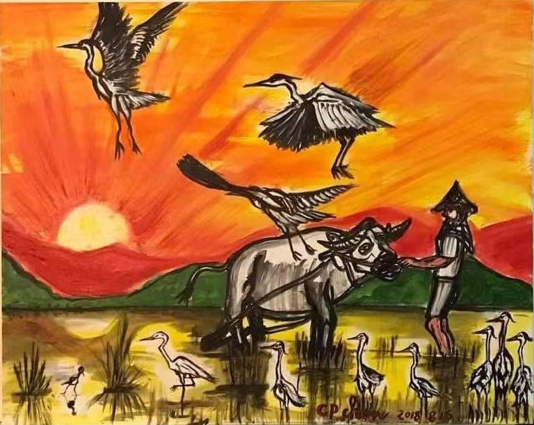 画面里,日出东方,霞光似火,为天地镀上崭新的色彩。这初升的太阳,宛如每日全新的开始,带来光与热,更带来希望与改变的可能。农夫与水牛在水田中劳作,他们的姿态并非僵化的重复,而是在日复一日的耕耘里,蕴含着对土地的新探索、对农时的新把握。每一次犁动,都是对旧有土地状态的打破,是为新的生命(作物)孕育创造条件,正契合 “苟日新”,每日都有新的作为与期盼。