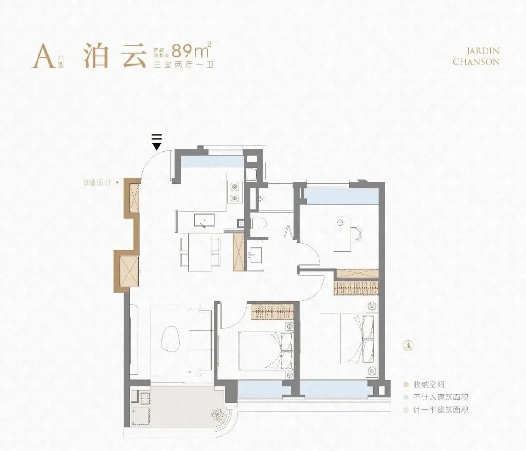 该户型的收纳,大量S墙的设计简直见缝插针,极大的扩容了家的储物角落,消减了业主生活的繁琐。