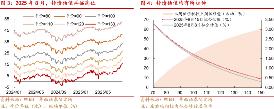 从价格结构来看,全市场转债价格中位数上升至132.09元,140元以上是转债市场分布最多的价位。截至2025年8月15日,全市场转债价格中位数为132.09元,加权平均值为130.43元,算术平均值为149.71元,分别环比上升1.41%、1.37%和2.91%。140元以上转债占比为31.63%,在转债市场中分布最多;其次为120-130元的转债,占比29.62%。