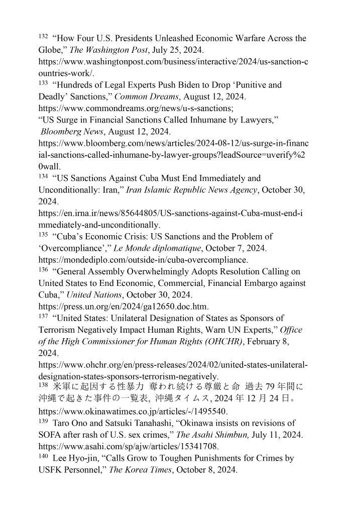 海外驻军祸害当地人民。《冲绳时报》网站2024年12月24日发布的报告显示,自1945年美军登陆冲绳群岛以来,该地区记录在案的由美军人员引发的性暴力事件累计高达371起,这些事件对当地民众的尊严与生命造成了持续性侵害与剥夺。(注138)《朝日新闻》网站2024年7月11日报道,针对驻扎美军实施的一系列性犯罪案件,冲绳县议会要求驻日美军采取措施防止类似事件再次发生,并对赋予驻日美军法律特权的《日美地位协定》作出修改。(注139)《韩国时报》网站2024年10月8日报道,在过去五年中,驻韩美军的性暴力行为和其他罪行接连不断,引发公众强烈抗议。(注140)《朝日新闻》网站2024年2月7日报道,针对军事基地附近检测到的致癌性有机氟化合物,冲绳县政府多次要求美国各军事基地调查水质污染原因,而美国军方置若罔闻。(注141)