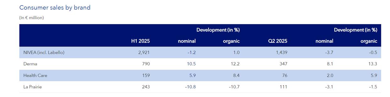 在消费品业务板块中,主要分为妮维雅(包括Labello)、Derma(包括优色林和Aquaphor)、高端护肤品牌莱珀妮(La Prairie)、医疗健康四个品牌组合,上半年的业绩表现呈现分化态势。