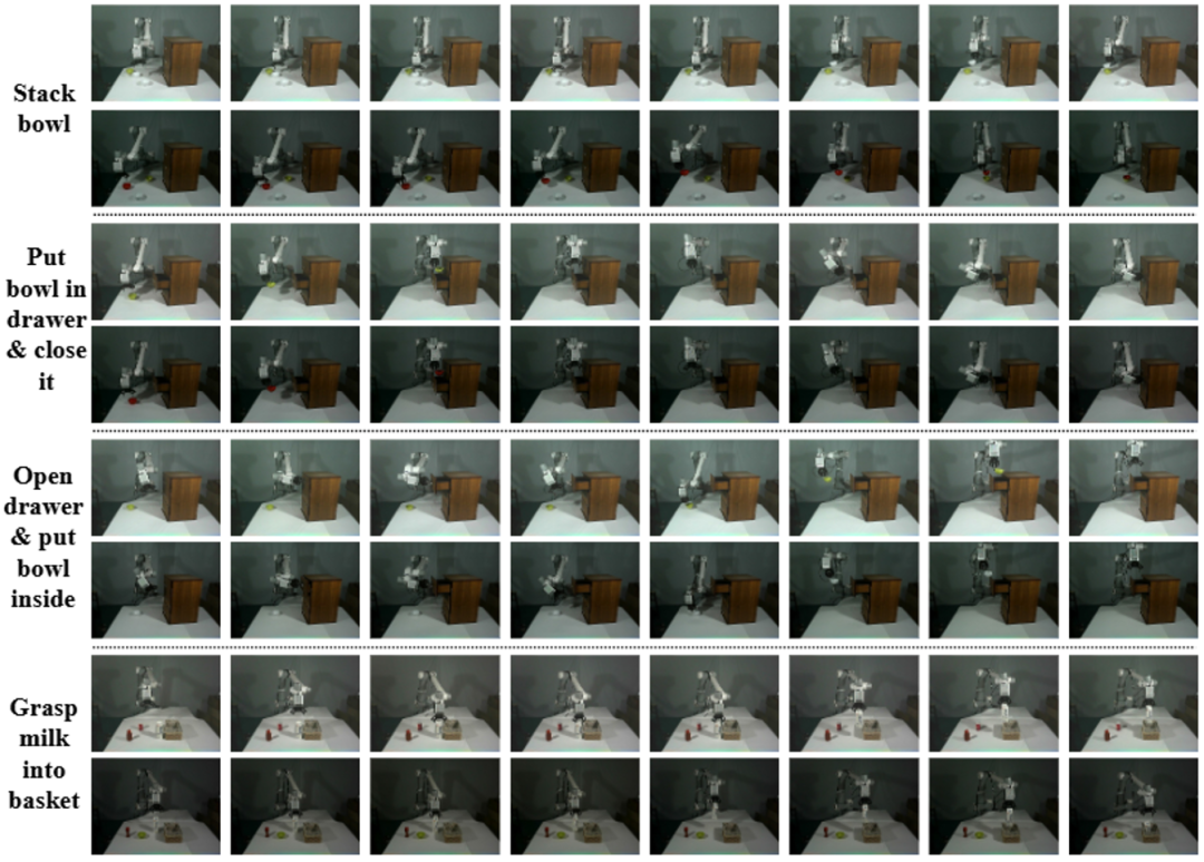 团队也在真实场景中验证了所提出框架的性能,具体操作任务包括「叠碗」、「开抽屉」、「关抽屉」以及「抓取物体放入篮子」等,如图 6 所示。