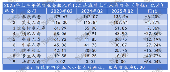 一家欢喜一家愁,2025年上半年有9家险企的保险业务收入规模连续两年上半年下降。分别为泰康养老、英大、恒安标准人寿、横琴、弘康、中华、信美、长生、华汇。