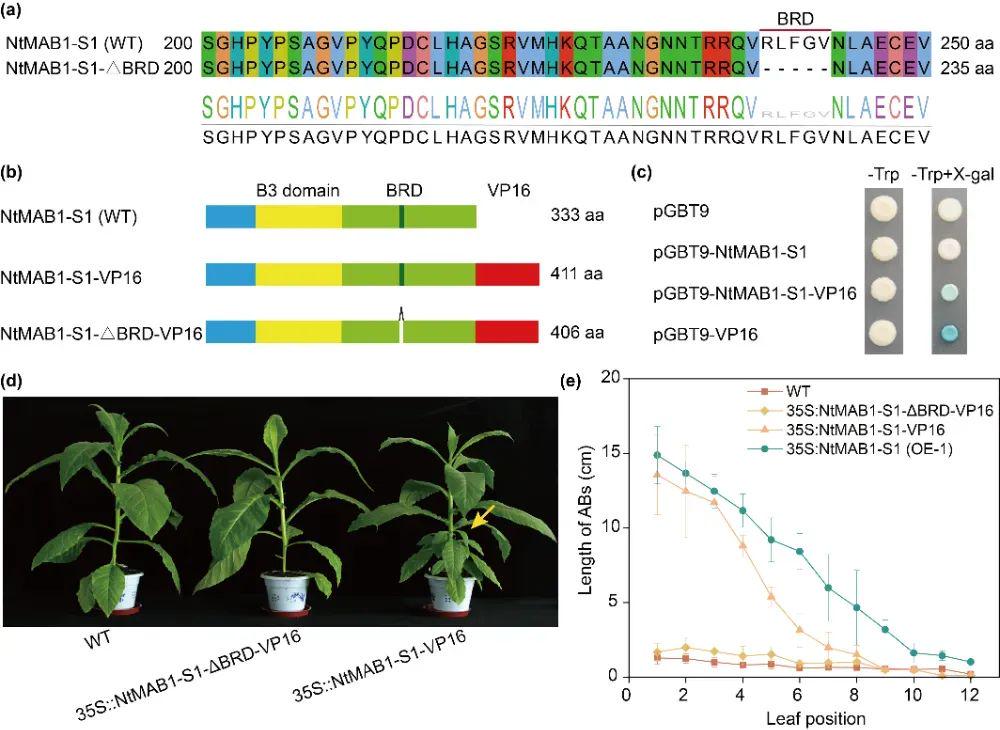 NtMAB1-S1通过 B3抑制域(RLFGV基序) 发挥转录抑制作用(图6c),删除该 结构 域则丧失 促分枝功能(图6d-e)。 表明 NtMAB1-S1 通过转录抑制调控分枝发育。