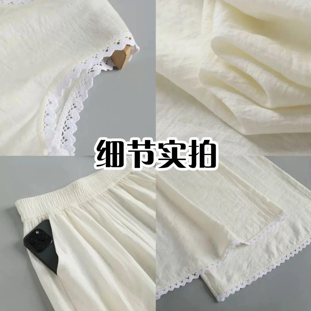 关键是板禾用的,还是蕾丝边圆领上衣+九分阔腿裤的搭配~