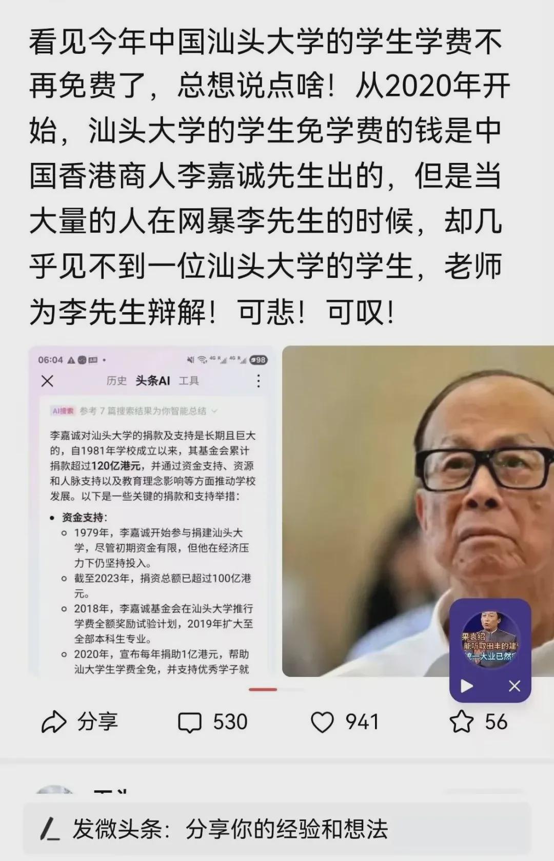 李嘉诚对汕头大学的捐款累计超过事件搞得焦头烂额,压力巨大;也让他的形象在“公摊”后再受质疑。那个期间内地基本没有人帮他说好话,就是一直接受他资助的汕头大学也没有出来说一句“公道话”。