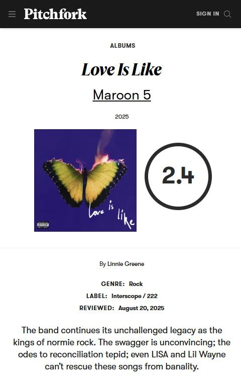 Maroon 5 最新专辑《Love Is Like》获 Pitchfork 打 2.4 分。