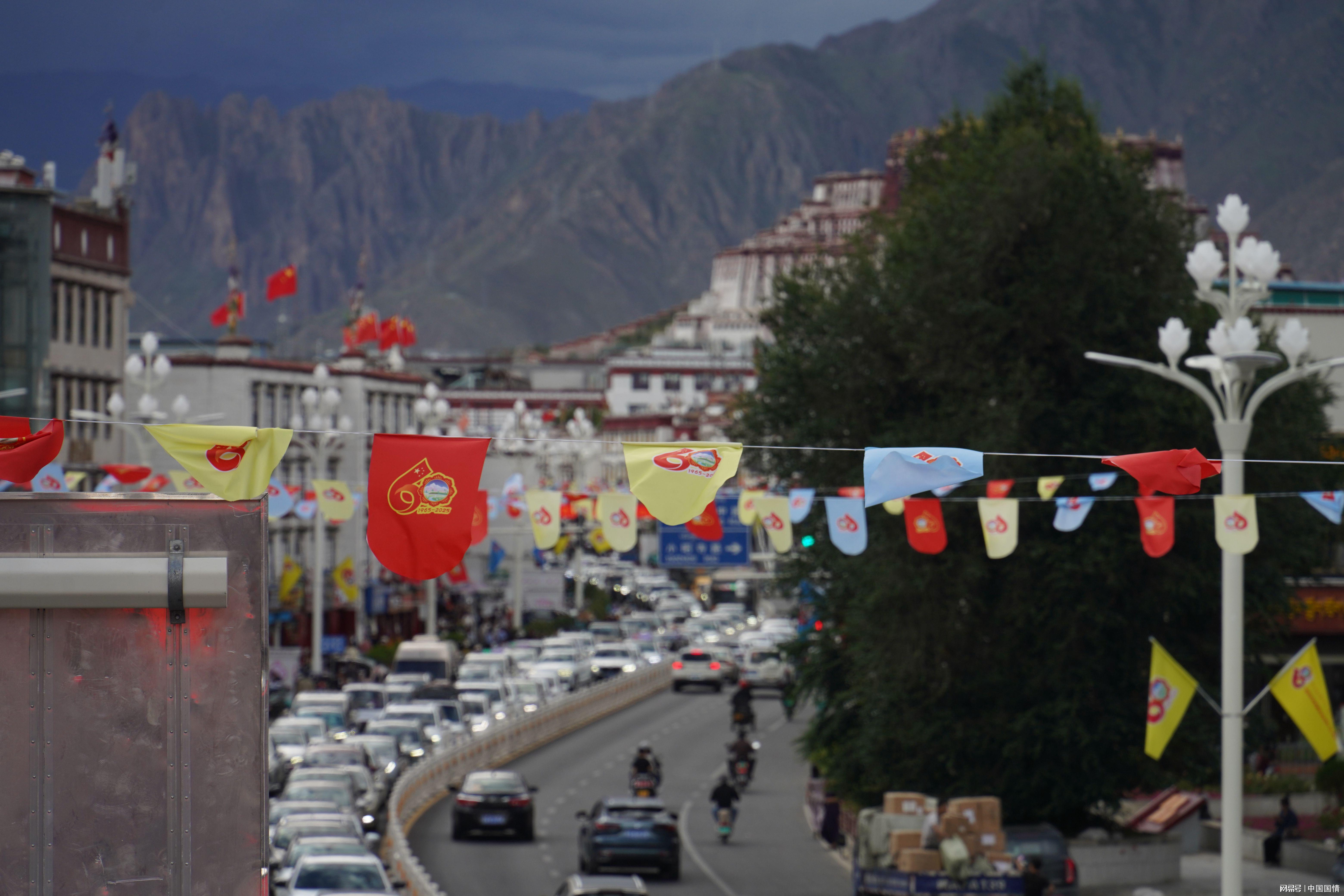 图为彩旗飘扬、装饰一新的拉萨市北京中路,远处就是布达拉宫(2025年8月20日摄)。中国外文局中国网记者 胡俊 摄