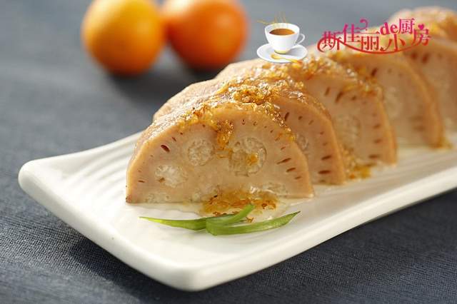 4. 将浸泡入味的糯米藕切成片后摆放在盘中,上面浇淋上糖桂花即可。