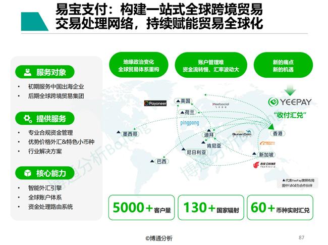 据悉,易宝支付搭建一站式全球跨境贸易交易处理网络,目前已建成覆盖130余个国家和地区的全球支付网络,支持60余种货币实时兑换,为出海企业提供全方位的跨境金融解决方案。紧扣客户需求,易宝提供专业合规资金管理、特色有优势的外汇能力和定制化的行业解决方案,更依托智能外汇引擎、全球账户体系、资金处理路由系统三大核心能力,为跨境贸易全流程保驾护航全面服务,确保跨境资金安全高效流转。