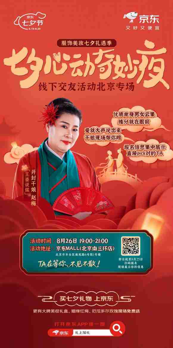 这个七夕,火爆全网的开封干娘来北京了!8月26日19:00,京东服饰美妆特别邀请“王婆说媒”栏目主持人开封干娘赵梅,在京东 MALL(北京南三环店)开启七夕线下交友专场活动,帮助单身青年们觅得良缘,现场还将送出大牌美妆礼盒、月老姻缘红绳、厄瓜多尔玫瑰及京东×小王子联名限定周边等精美好礼,京东服饰美妆采销直播间将全程直播。正值七夕礼遇季,打开京东APP搜索“礼上加礼”,购买美妆、黄金珠宝、时尚腕表等七夕礼物,可获得小王子联名永生花,还可享受官方立减12%、品牌购物卡充1000得1314等多重优惠。