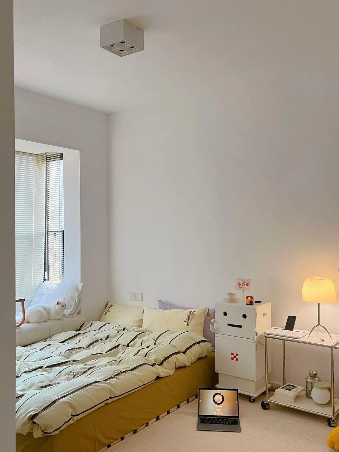 次卧设计没必要搞得太复杂,有时候越简单越实用。就像网友 @剌剌 家的做法,在地面铺个实木排骨架,然后再放一张22cm厚的床垫,整个房间瞬间变得开阔又通透,在床上蹦蹦跳跳随便翻滚都没事,完全没有传统家具带来的束缚感。