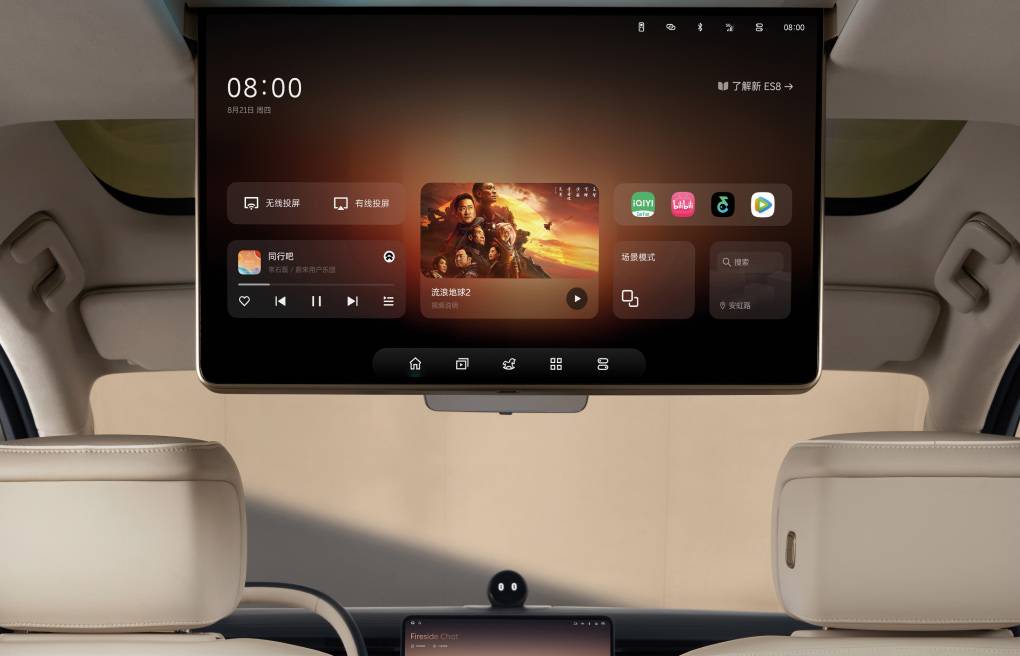 在座舱氛围感的营造上,蔚来舍弃了过去偏简约冷淡的北欧风格,豪华感强了不少。全新 ES8 不仅拥有和 ET9 同款的 Skyline 数字天际线、15.6 英寸 AMOLED 中控屏、灵犀岛、NOMI Mate3.0,还配备了车规级 21.4 寸 MiniLED 后排娱乐屏以及由前后一直贯穿至尾箱的氛围灯。