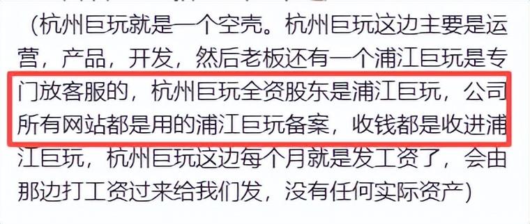 有网友透露杭州巨玩就是一个空壳,杭州巨玩的全资股东是浦江巨玩,杭州巨玩没有任何实际资产。