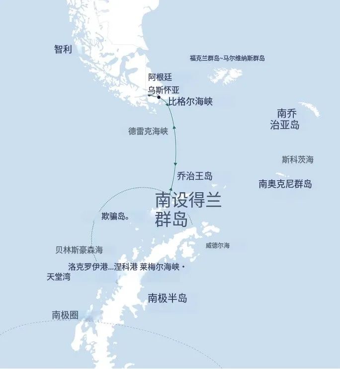 轨迹:国内集合 → 布宜诺斯艾利斯 → 乌斯怀亚·登船→ 南极半岛 → 德雷克海峡 → 乌斯怀亚·下船 → 布宜诺斯艾利斯 → 利马 → 库斯科 → 马丘比丘 → 亚马逊雨林 → 的的喀喀湖 → 拉巴斯 → 乌尤尼盐湖 → 圣保罗 → 里约热内卢 → 伊瓜苏瀑布 → 布宜诺斯艾利斯 → 返程回国