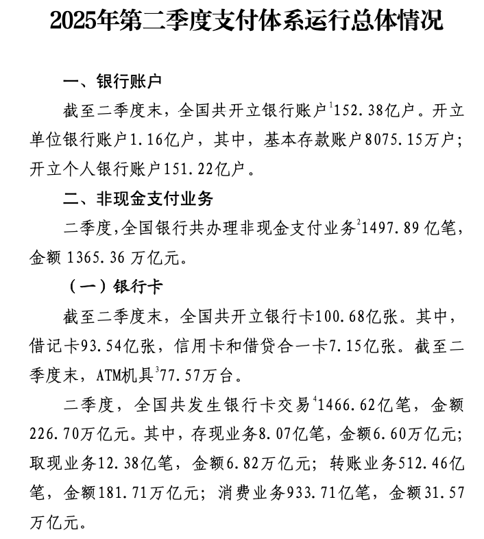 近日,中国人民银行发布2025年第二季度支付体系运行总体情况。