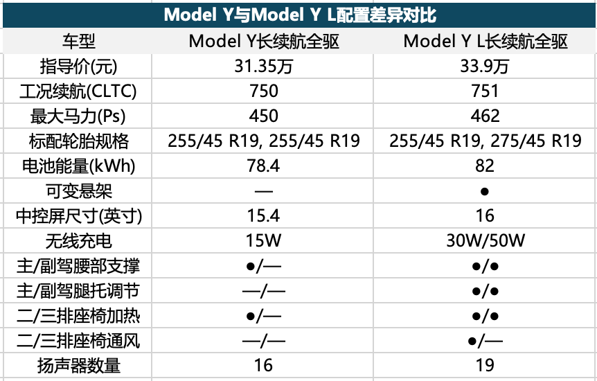 以上都还只是基于尺寸、座位数的对比,实际上Model Y L和Model Y之间的差别,远不止于尺寸。我们来看看Model Y L和Model Y四驱版在配置方面的具体差异: