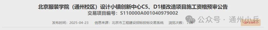 此外,相关网站还发布了“北京服装学院(通州校区)设计小镇创新中心A7、A8、C4、C7、C8楼改造项目施工(监理)”资格预审公告,建设规模为33623.06平方米。