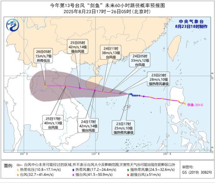 大风预报:8月23日20时至24日20时,南海大部及西沙群岛和中沙群岛、北部湾、琼州海峡、海南岛沿海、广西沿海、广东西部沿海将有6-8级大风,其中南海西北部和中西部及西沙群岛部分海域、海南岛南部沿海的风力有9-11级,“剑鱼”中心经过的附近海域或地区的风力可达12-14级、阵风15-16级。