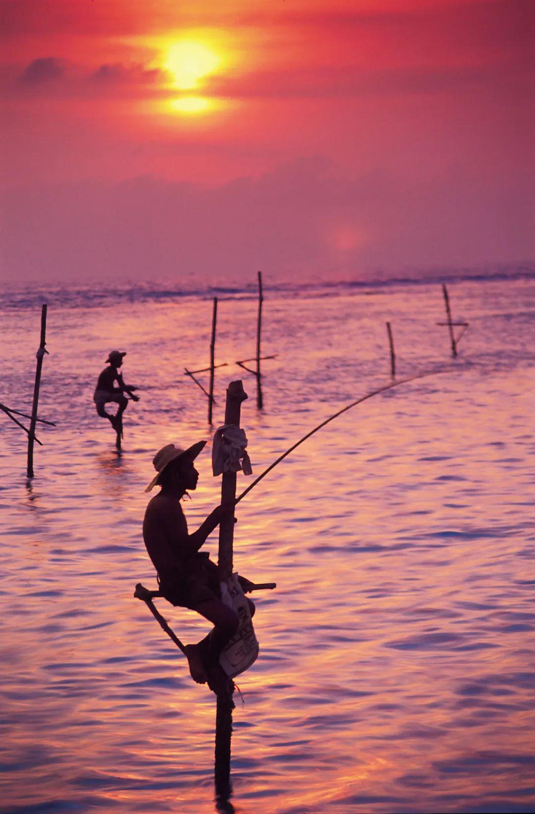 斯里兰卡的传统渔民,特别是在加勒附近的卡卢特勒(Kalutara),仍然保持着高跷钓鱼的传统技艺。这项技法起源于殖民时期,为了避开礁石上的鱼群,渔民们开始在木桩上用高跷钓鱼。如今,这项技艺成了五百卢布一次的收费摆拍项目,而真正的渔民早已转行,木桩上的“渔民”多是“职业模特”。