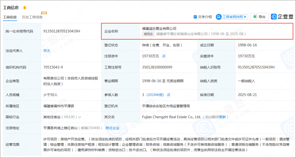 8月21日,平潭红岩海滨山庄有限公司名称发生变更,变更后名称为福建诚志置业有限公司,法人由刘飞跃换做郑杰,这不禁让外界对项目是否重启愈发关注。