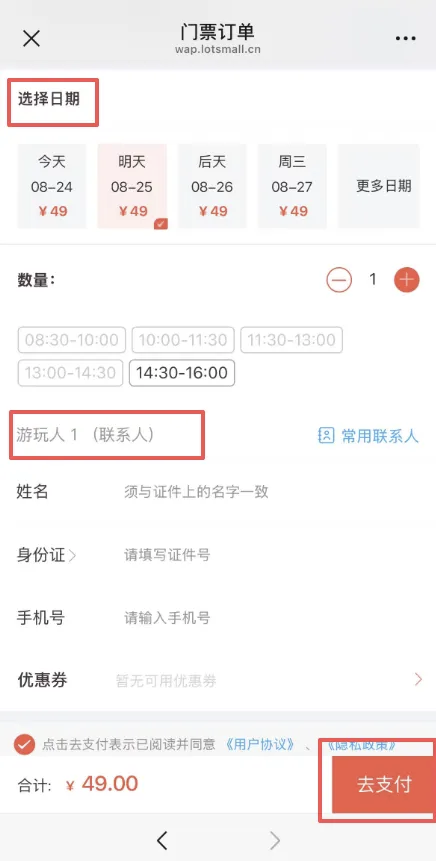 3. 确认日期、时间段,添加个人信息后完成支付,支付成功即生成验票码;