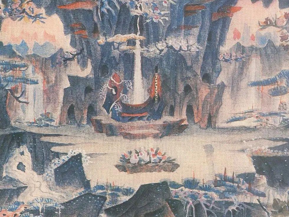 1960年,“美猴王”之父张光宇为《大闹天宫》设计的场景画稿,他从佛、道两教的建筑、笔画提炼升华而达庄严妙象之境,结蓝、群青、桃红、精石、鲜紫 及红、黄、蓝原色这些难以驾御之色,却成为张氏画面之常用及专施,形成了他独具的色谱。
