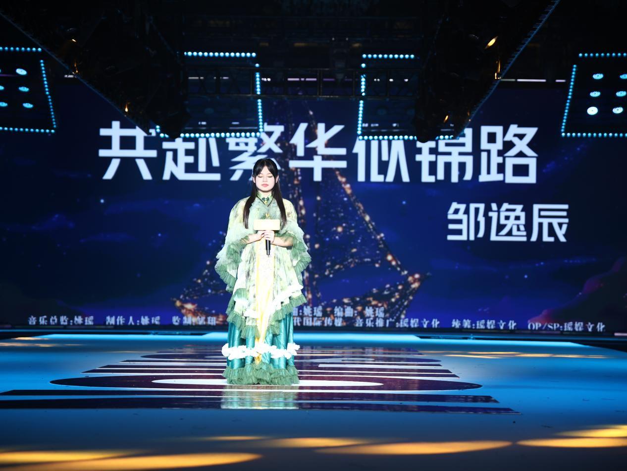 此次;邹逸辰再度登台,献唱原创歌曲《共赴繁花似锦路》。她的歌声清亮且富有穿透力。表演中,她台风稳健,时而与台下互动,时而用肢体强化情感,将少女对未来的憧憬展现得淋漓尽致,全场观众自发跟拍鼓掌,氛围被推向顶峰,嘉宾纷纷称赞这场表演是 “少年正能量的生动传递”。