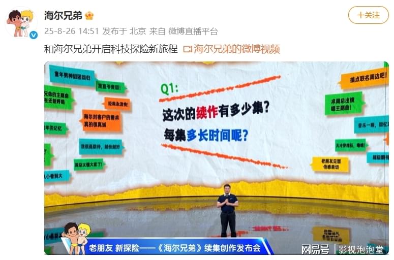 哇塞,等了这么多年,《海尔兄弟》续集终于官宣了!就在昨天(8月26日),海尔集团的老大周云杰亲自在北京的发布会上揭晓:续集定档2027年春节前后上线!掐指一算,也就一年半左右,童年回忆马上就能接上了。