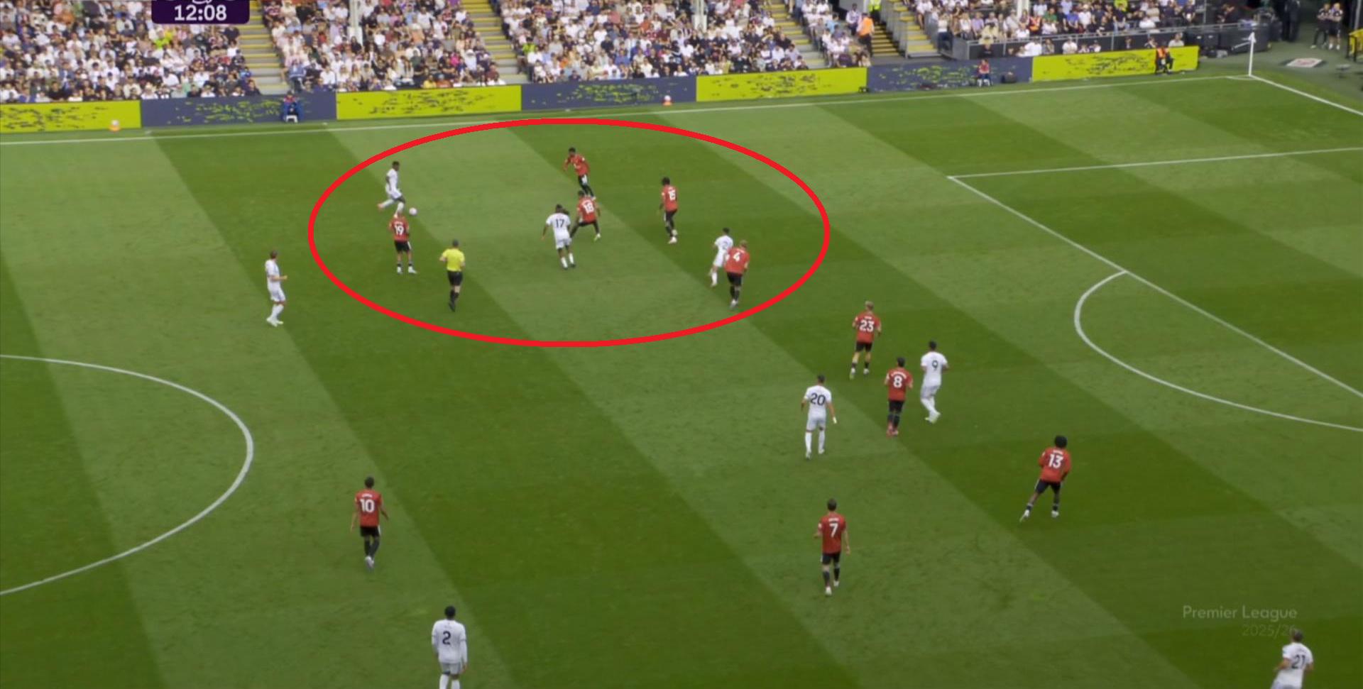 富勒姆开展进攻端的时候,曼联在中前场的3-2站位就已经非常清晰了: