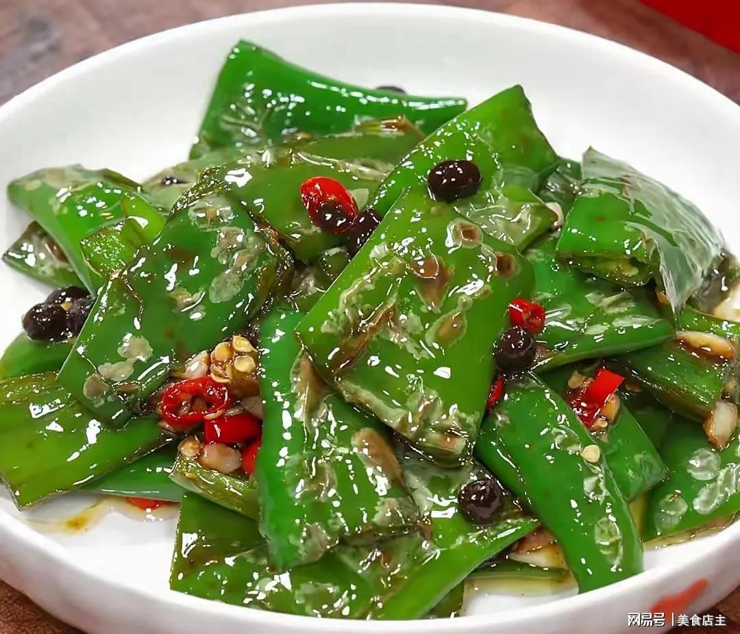 2、起锅热油,放入青椒煎至表面焦黄,煎时不断按压青椒,使其双面呈虎皮状。