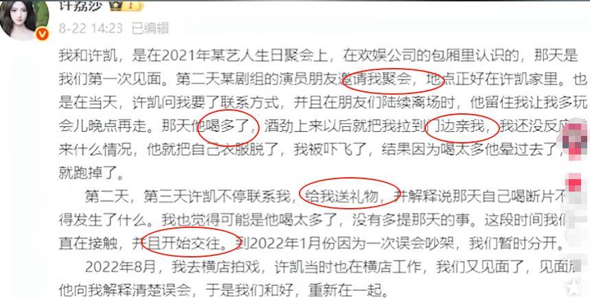 【2】极目新闻,8月22日,“许荔莎发文回顾与许凯恋情时间线,自称恋爱期间许凯多次劈腿。许荔莎:第二次见面他喝多了,酒劲上来就亲我”