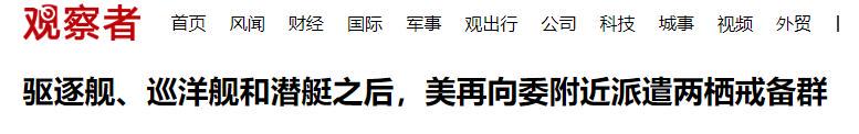 先前,美方已经派出3艘“宙斯盾”驱逐舰“桑普森”号、“格雷夫利”号和“杰森·杜汉姆”号,抵达委内瑞拉海岸附近,后续包括“提康德罗加”级导弹巡洋舰“伊利湖”号、“洛杉矶”级攻击核潜艇“纽波特纽斯”号也将抵达附近海域,数架P-8A海上巡逻机也会随之部署到位。