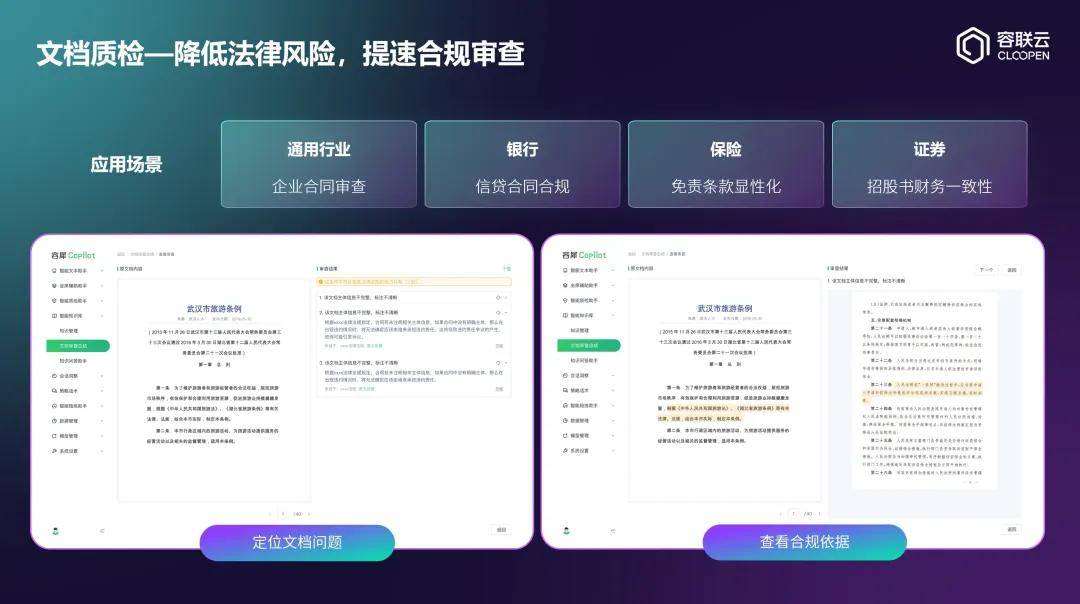 合同、协议等法律文书的合规性,直接关系企业法律风险。容联云提供强大的文档质检能力,通过OCR文本提取+大模型语义解析,实现合同内容的自动对比与条款一致性校验。