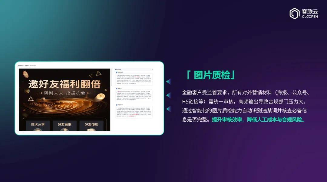 容联云基于NLP+OCR图文质检能力,自动识别违禁词、极限词,并校验是否包含“风险提示”等必备信息。该能力可提升审核效率数倍,并在客诉或处罚发生前主动预警,有效降低风险隐患。