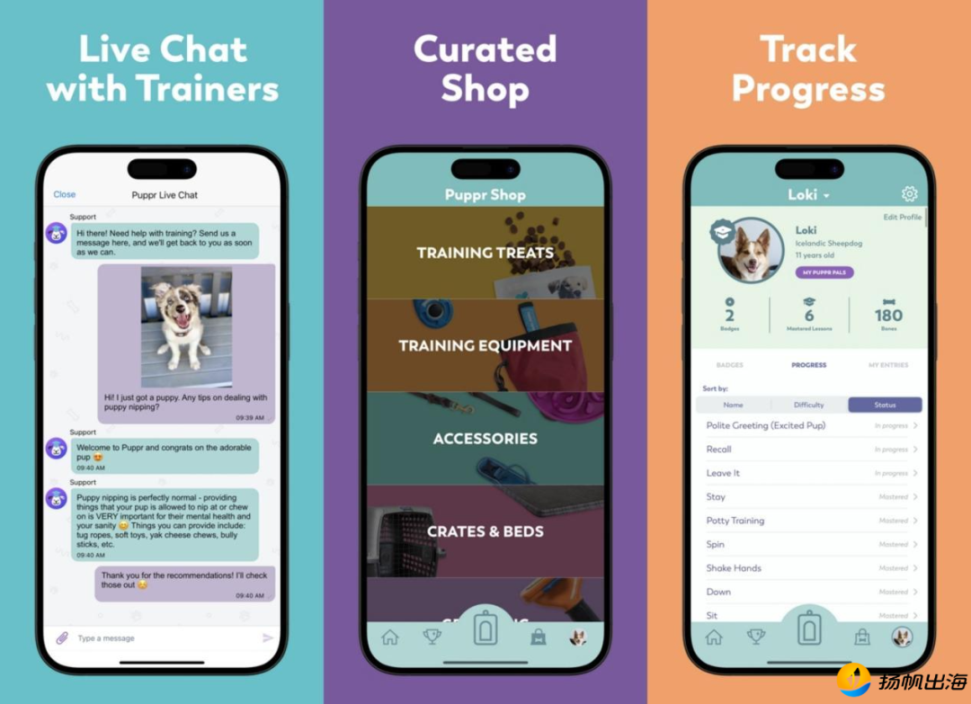 另一款应用Puppr强调应用内训练课程由美国知名训犬师Sara Carson提供专业背书,保证内容的权威性。同时,Puppr搭建了“家长交流社区”,用户可以在其中分享经验、上传照片视频“晒犬”,展示狗狗已经掌握的技能,增强了用户之间的互动性。值得关注的是,Puppr还开设了内置商店,用户不仅可以购买第三方品牌的宠物用品(如智能项圈),还可选购平台自有的文创周边,形成了从训练到消费的闭环。