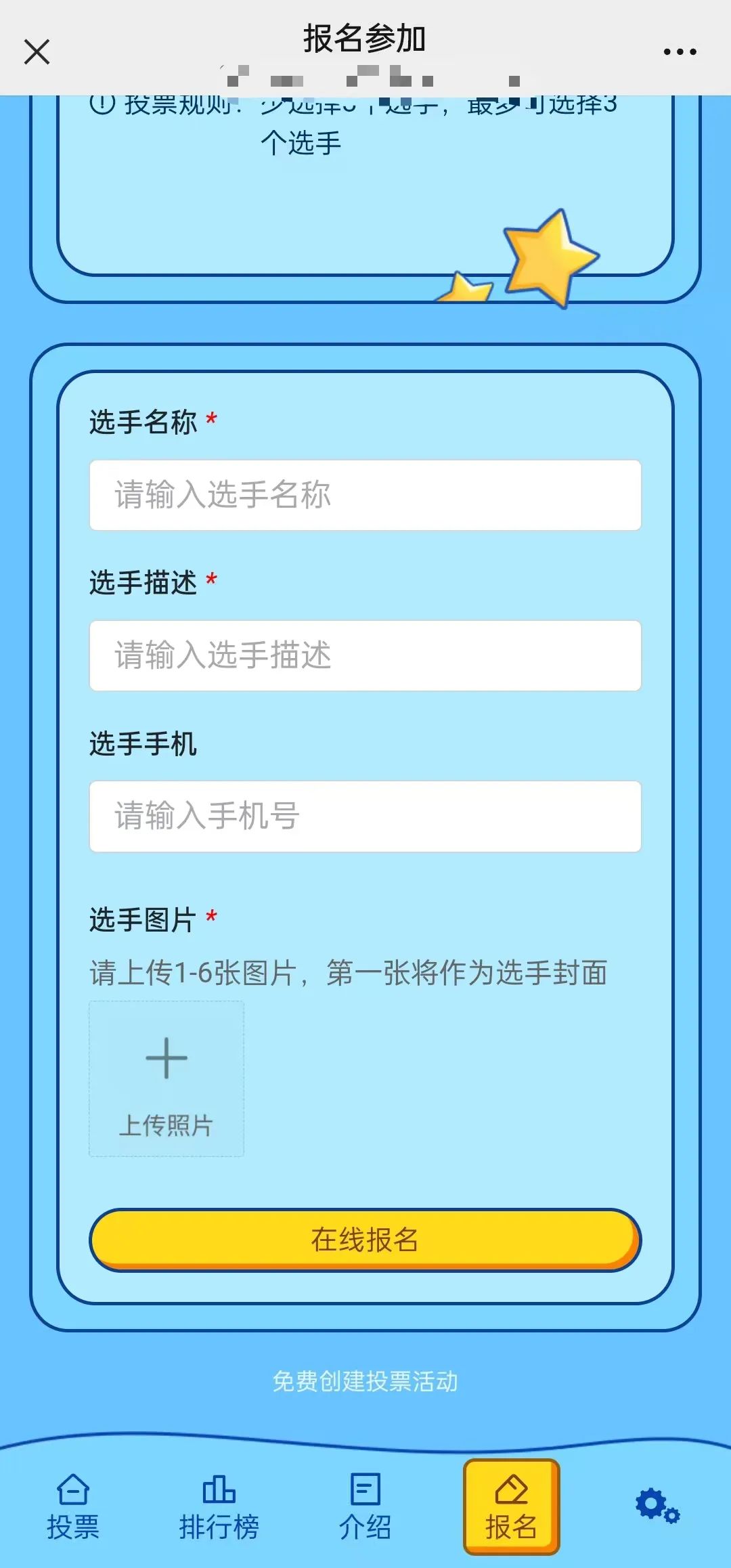 1.选手征集:进入活动上传个人介绍信息。