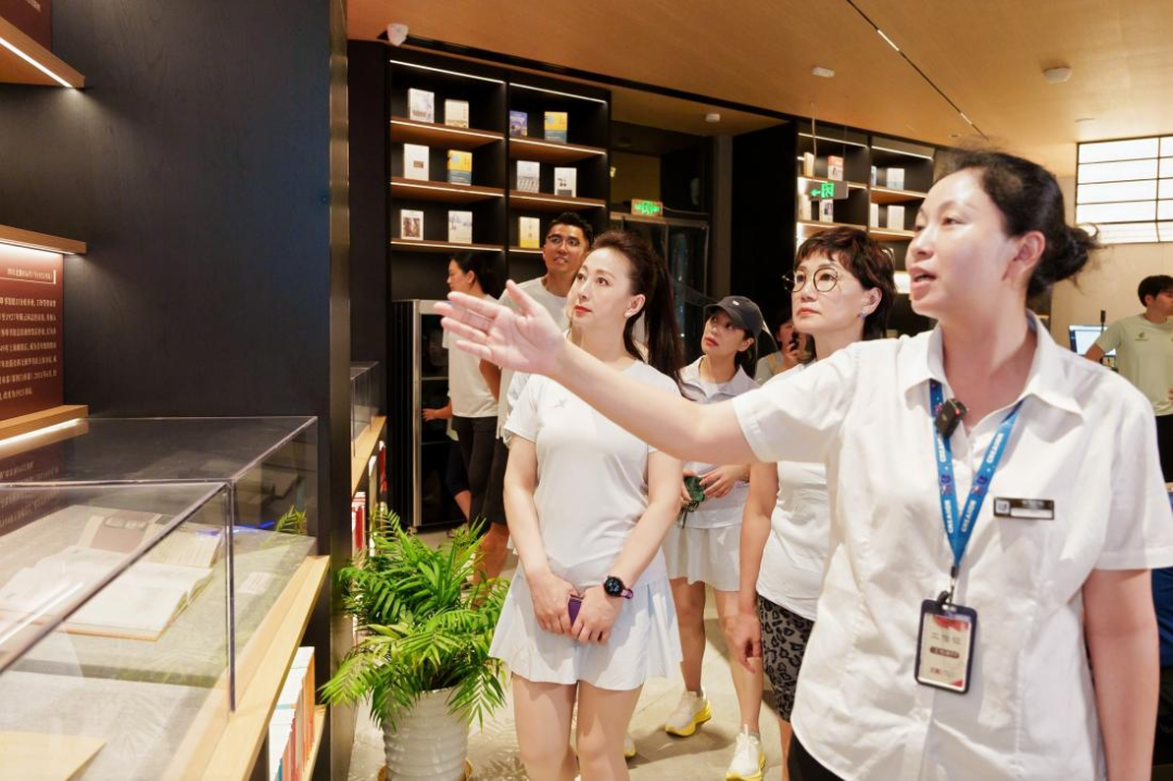 跑友们踏进综合馆时已近七点,书院里仍散坐着许多人。上至耄耋老人,下至垂髫小儿,每个人都全神贯注于自己面前的那本读物。与门外热闹的市井截然不同,这里静谧典雅而又充满着现代气息。书院管理员一边引导大家参观,一边向大家介绍了书院的基本情况和发展理念:和平书院是上海首个24小时城市公园图书馆,由四栋主题馆、一个艺术馆和一个中心阅读绿地组成,犹如一本在和平公园中心“打开的书”。它也是虹口区践行“人民城市”“公园城市”理念,推出的文化与绿地相融合、阅读和行走皆相宜、生态和生活均可享的公共文化空间。