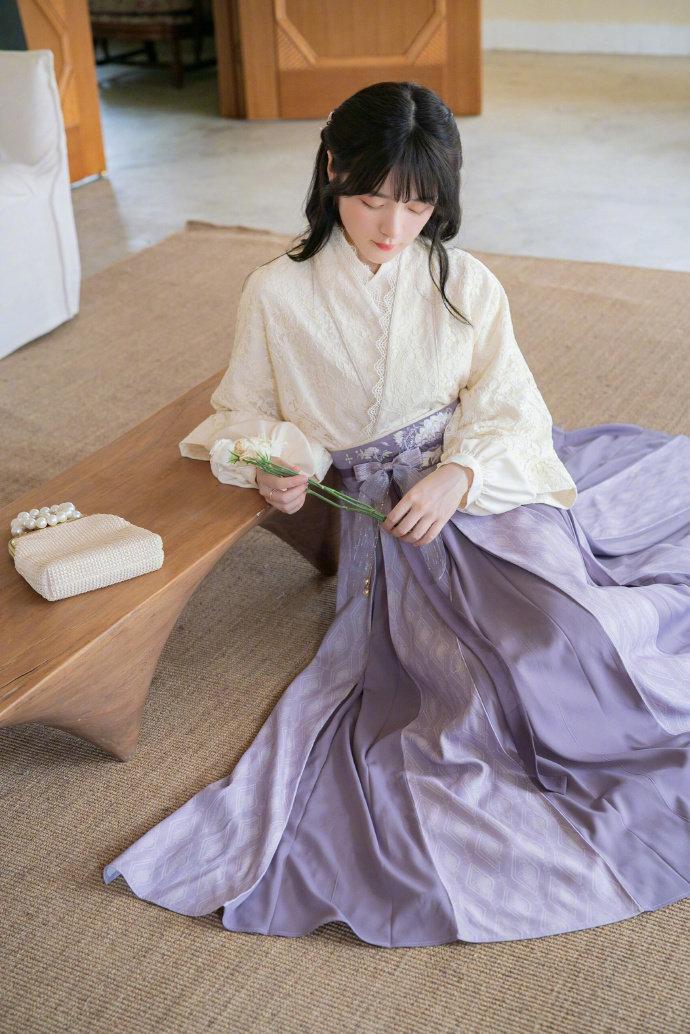 有特色,还不会太累赘,马面裙紫色带来的贵气感和气质也不是一般服饰可以比拟的。