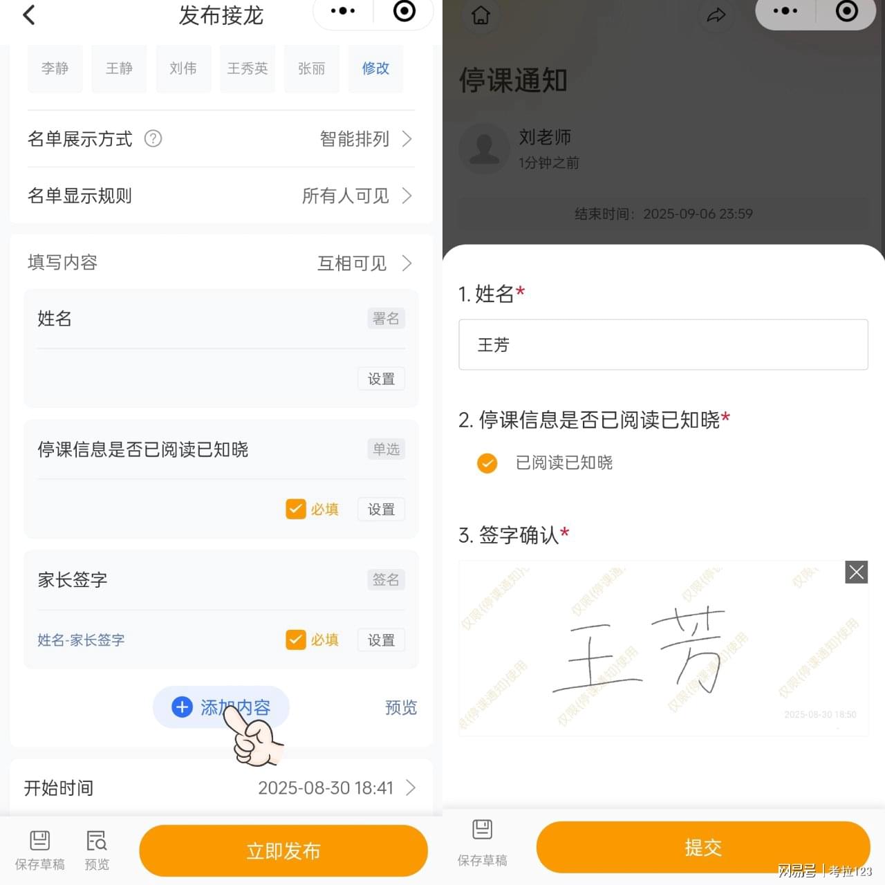 不少老师用群接龙或者直接发通知,但群里消息刷得比翻书还快,家长稍不注意就错过;老师还得翻聊天记录,数 “谁没接龙”“有没有重复”,又累又麻烦。更愁人的是,像保险确认、走读申请这种要签字的重要通知,普通接龙根本搞不定,漏了信息和家长解释都难。