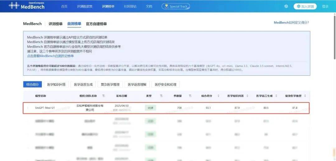 云知大脑(UniBrain),作为中央技术平台,其核心为山海大模型。该模型自2023年发布以来,已拓展了RAG、Agent、多模态融合、推理强化等关键能力,参数规模达千亿级,在多个权威评测中处于第一梯队。山海医疗版更是多次获得MedBench评测第一名。