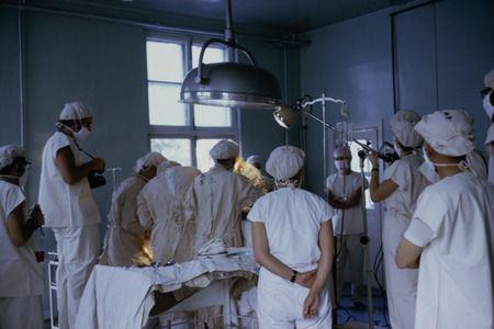 1973年8月,几名外科医生在旅大市第二人民医院进行手术。手术病人躺在手术台上,周围有医护人员,一名医护人员正在给他喂桃子。