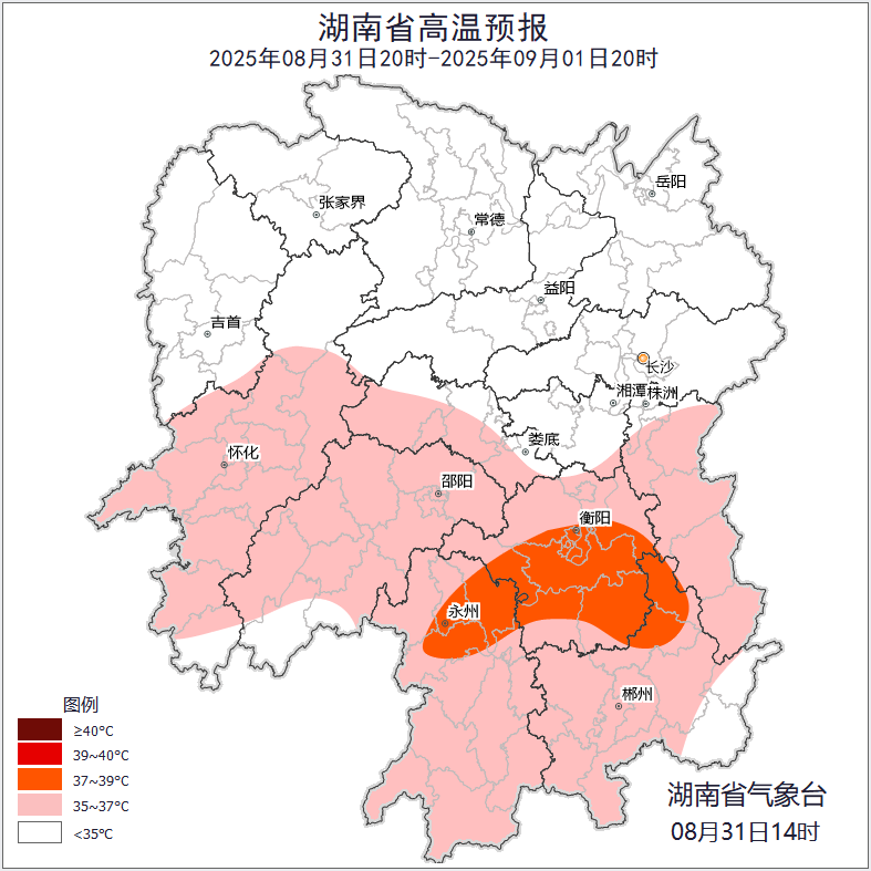 预计9月1日白天,湘中、湘南大部分地区有35℃以上高温,其中衡阳、永州北部、郴州北部局地将达37℃以上,请做好防范。